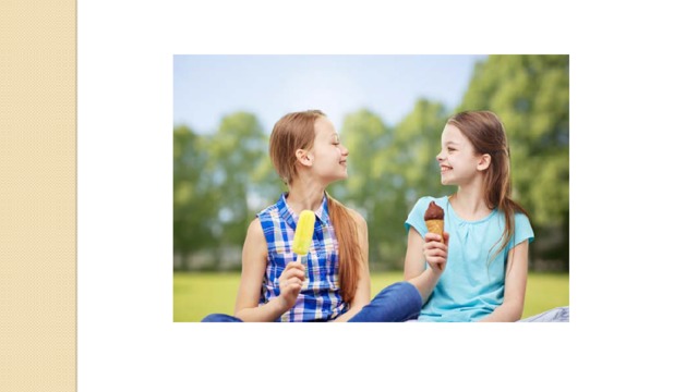 My sister and her friend are sitting on the grass, they are looking at each other. They are smiling happily because they are enjoying the day and the company of each other, besides they are eating tasty ice-cream. They must be discussing something pleasant.