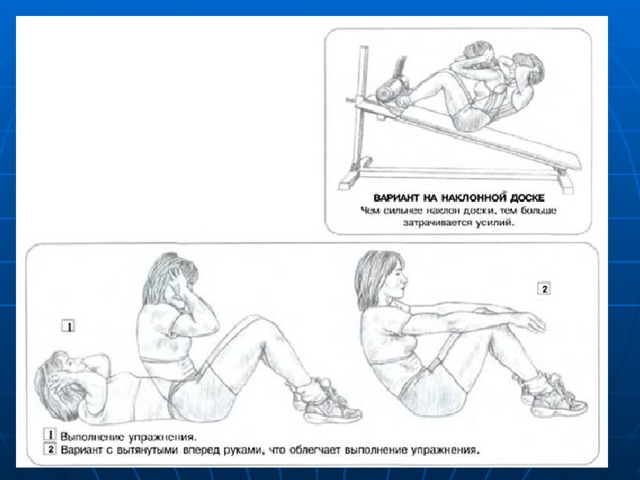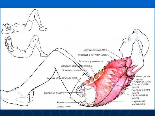 - Выполнение. Поднять туловище, локтями коснуться колен. После этого опуститься в исходное положение до касания лопатками пола.