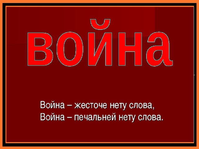 Война принесла много страха и горя, и длилась она 1418 дней и ночей. 27 000 000 погибших людей. Это значит 20 человек умирали каждую минуту Если по каждому погибшему из 27 миллионов, в стране объявить минуту молчания, страна будет молчать…32 года! 27 миллионов могил на 2,5 тысячи километров – это значит 7, 5 тысяч убитых на километр, пятнадцать человек на каждые два метра земли! Страшные цифры…