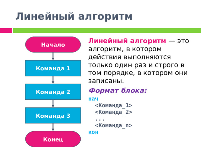 Линейный алгоритм — это алгоритм, в котором действия выполняются только один раз и строго в том порядке, в котором они записаны.