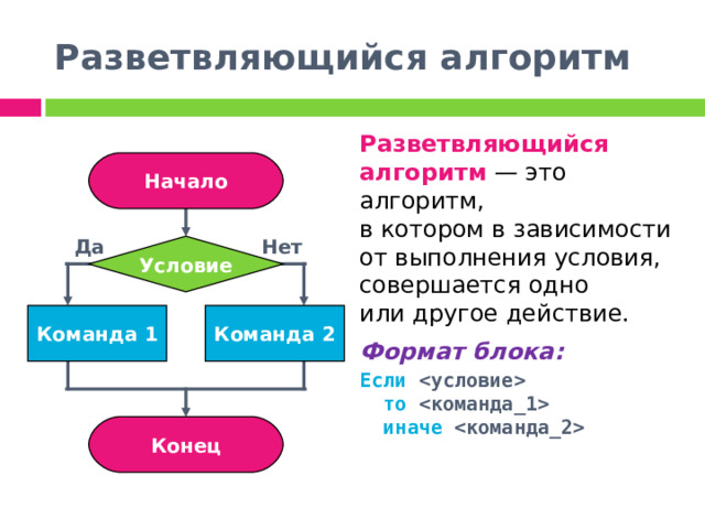 Разветвляющийся алгоритм — это алгоритм, в котором в зависимости от выполнения условия, совершается одно или другое действие.