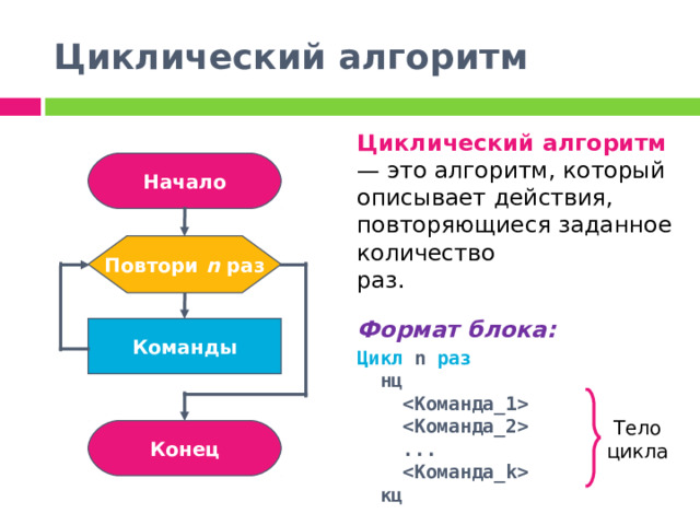 Команда _ 2 ... Команда _k кц Начало Повтори n раз Команды Тело цикла Конец " width="640"