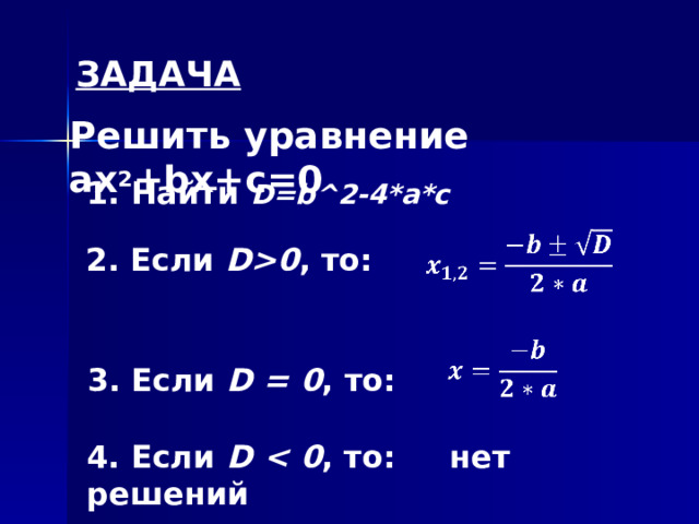 - Рассмотрим задачу: решить уравнение ax 2 +bx+c=0. Как вы будете решать задачу?