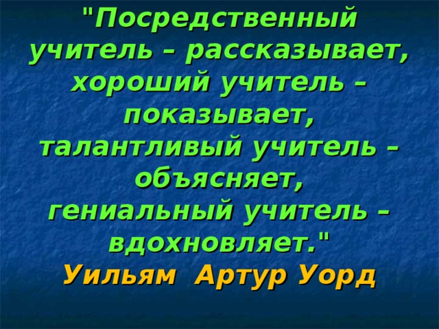 "Посредственный учитель – рассказывает, хороший учитель – показывает, талантливый учитель – объясняет, гениальный учитель – вдохновляет." Уильям Артур Уорд