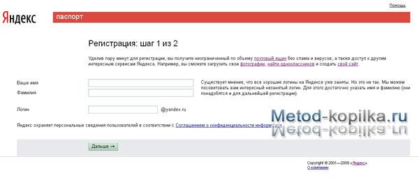 При введении Вашего имени и Фамилии будут предложены автоматически свободные логины, понравившийся вы можете выбрать или придумать собственный, который будет проверен почтовым сервером, занят ли он другим пользователем.