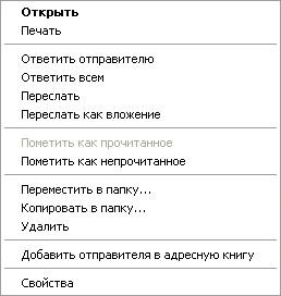 | Примечание: В контекстном меню представлены возможные действия с почтовым сообщением. Проанализируйте назначение основных (Открыть, Ответить отправителю, Переслать, Переместить (скопировать) в папку, Удалить) и спрогнозируйте результат их выполнения. |