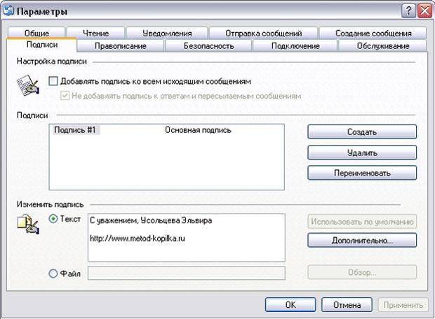 Цель упражнения: Формирование навыков оптимизации подготовки сообщений за счет автоматического добавления подписи к отправляемым и пересылаемым сообщениям.