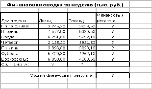 Создать таблицу финансовой сводки за неделю, произвести расчеты, построить диаграмму изменения финансового результата, произвести фильтрацию данных.