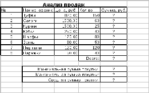 2. Заполнить таблицу, произвести расчеты, выделить минимальную и максимальную суммы покупки; по результатам расчета построить круговую диаграмму суммы продаж.
