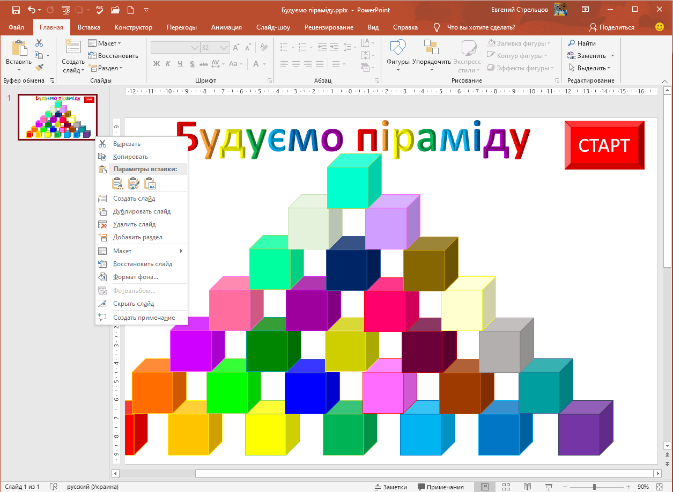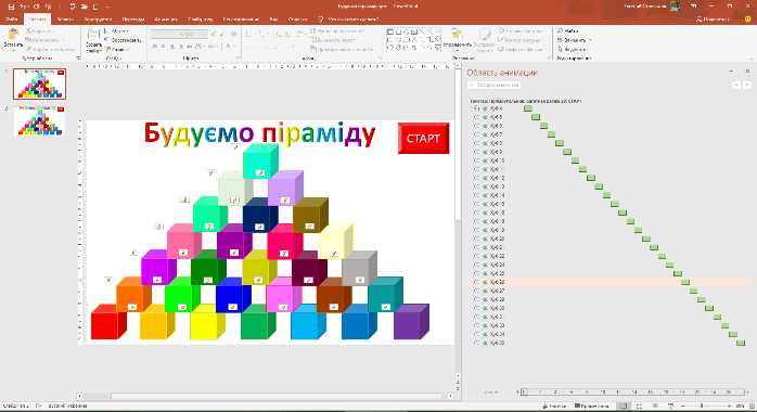 Перевіряємо правильність складання піраміди при натисканні кнопки «Старт» в режимі показу слайдів. Вкладка Слайд-шоу – З початку. Є ймовірність випадкового клацання мишею повз налаштованого об'єкта з тригером. Тоді відбудеться зміна слайда на наступний. Щоб це виключити, треба прибрати "галочку" у вкладці Переходи - Зміна слайдів "Після клацання".