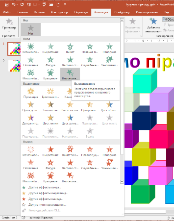 Повертаємося до Слайду 1. Налаштовуємо анімацію. Для цього виділяємо всі кубики лівою кнопкою миші, натиснувши і утримуючи клавішу Shift на клавіатурі. Використовуємо Вкладку Анімація - настройка анімації - додати ефект - вхід - вискакуванню.