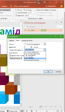 Налаштовуємо анімацію для кубиків. Для цього виділяємо всі кубики. Далі Вкладка Анімація - настройка анімації - додати ефект - вихід - Виліт по спіралі. Швидкість - швидко, початок - після попереднього.