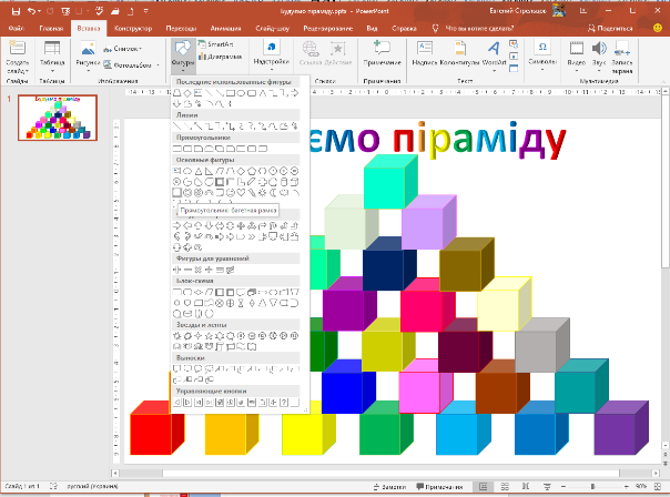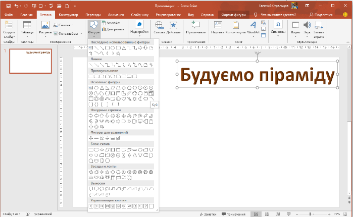 Створюємо перший кубик на поле слайда: вкладка Вставка - Фігури - Основні фігури - Куб.