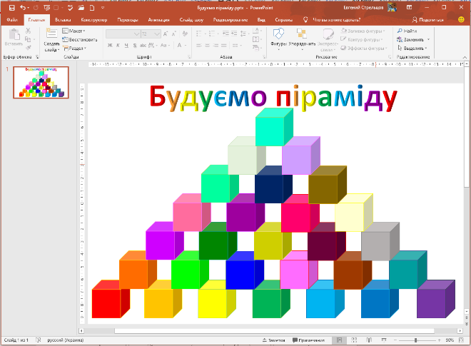 Переходимо до другого слайду. В поле «Тема» міняємо текст заголовка на «Розбираємо піраміду».