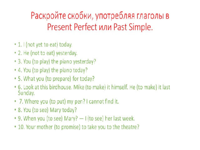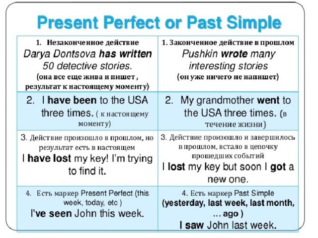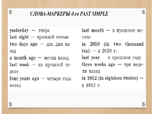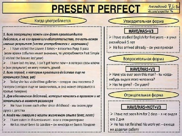 ever – когда-либо, когда бы то ни было, когда-нибудь; never – никогда; just – как раз, точно, едва, только что, всего лишь, совсем, только-только, лишь, сейчас; already – уже, ранее, даже; not … yet – все еще нет, нет еще, еще не, нет, еще нет; before – раньше, прежде, пока не, уже, перед тем как; lately – давно, в последнее время, недавно, за последнее время; of late – с недавних пор, за последнее время, недавно; so far – уже, к настоящему времени, на этот час, пока, до сих пор, вплоть до этого момента; recently – недавно, на днях, в последнее время, только что, не так давно; by now – на настоящий момент; up to now – до сих пор, до настоящего времени; since – с (с какого-то момента); still – все еще. For- в течении какого-то периода времени