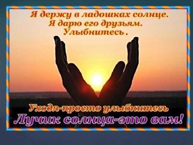 Улыбнитесь и протяните ваши ладошки друг другу, возьмитесь за руки. ( Дети встают в круг, и за учителем повторяют строчки) Лучик, лучик золотой,