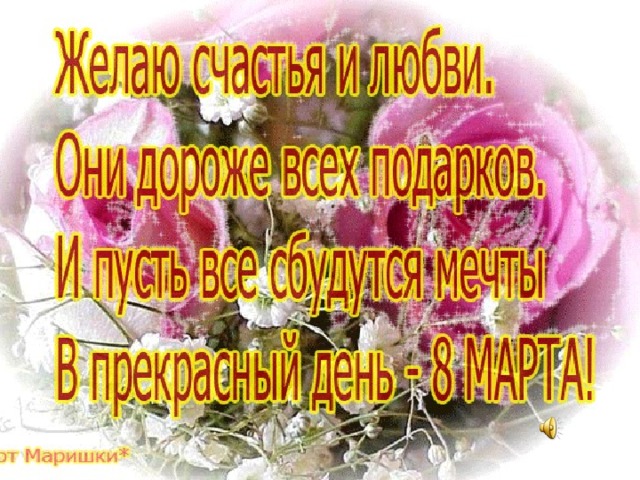 Ведущий. Сегодня мы поздравляем самых дорогих нам людей – наших мам, бабушек, девочек. В эти весенние дни мы желаем всем счастья и радости, здоровья, семейного тепла и благополучия. Пусть птицы в этот день поют звонче, весеннее солнце светит ярче, а нас никогда не покидает весеннее настроение.
