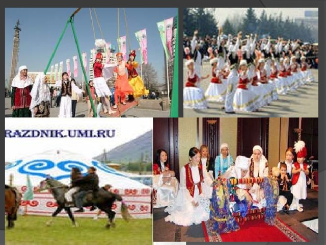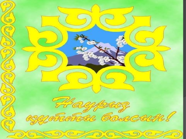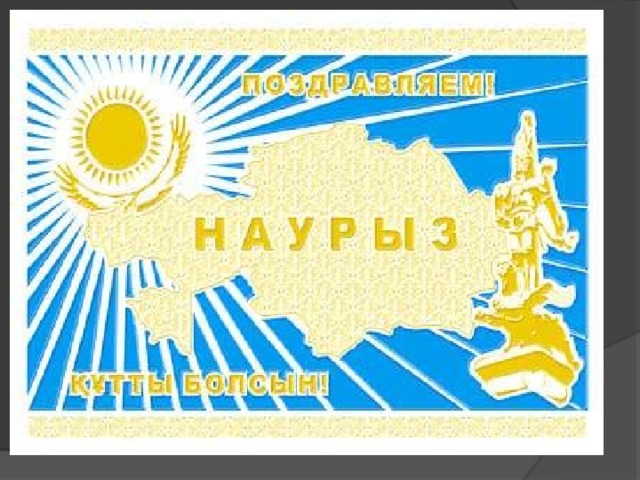 НАУРЫЗ - жыл басы, ұлыс-тың ұлы күні. Күн мен түннің, ыстық пен суықтың, қыс пен жаздың, қараңғы мен жарық-тың теңеліп, жер арқасы кеңіп, жан-жануарлар, өсімдік дүниесі, күллі тіршілік әлемі жан алып, қайта түлейтін Табиғат мерекесі.