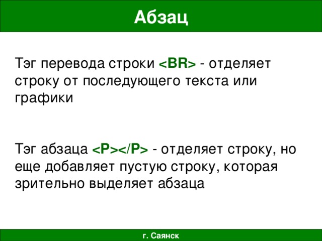 - отделяет строку от последующего текста или графики Тэг абзаца P - отделяет строку, но еще добавляет пустую строку, которая зрительно выделяет абзаца г. Саянск " width="640"