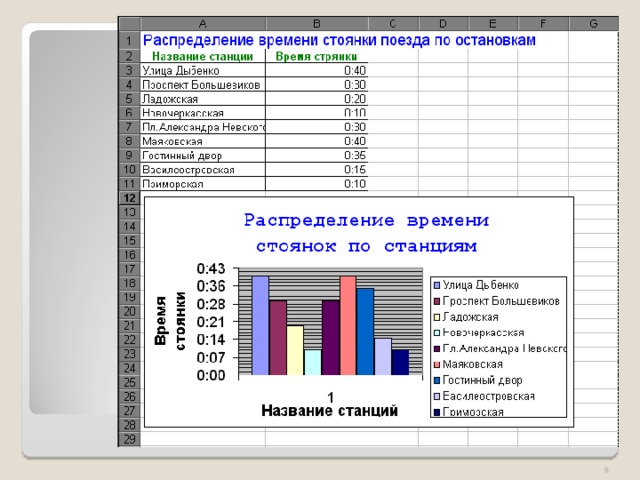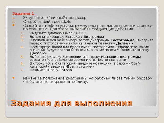 Посмотрите, какой вид будет иметь гистограмма. Определите, какие значения будут показаны по оси X , а какие по оси Y . Нажмите кнопку Далее Выберите вкладку Заголовки и в строку Название диаграммы введите «Распределение времени стоянок по станциям» В строку «Ось Х категорий» введите «Станции»; в строку «Ось Y категорий» введите «Время стоянки» Нажмите кнопку Готово Выделите диапазон ячеек А3:В11 Выполните команду Вставка / Диаграмма В появившемся окне выберите тип диаграммы Гистограмма. Выберите первую гистограмму из списка и нажмите кнопку Далее Посмотрите, какой вид будет иметь гистограмма. Определите, какие значения будут показаны по оси X , а какие по оси Y . Нажмите кнопку Далее Выберите вкладку Заголовки и в строку Название диаграммы введите «Распределение времени стоянок по станциям» В строку «Ось Х категорий» введите «Станции»; в строку «Ось Y категорий» введите «Время стоянки» Нажмите кнопку Готово Измените положение диаграммы на рабочем листе таким образом, чтобы она не закрывала таблицу. Задания для выполнения " width="640"