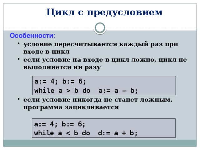 - условие пересчитывается каждый раз при входе в цикл если условие на входе в цикл ложно, цикл не выполняется ни разу если условие никогда не станет ложным, программа зацикливается