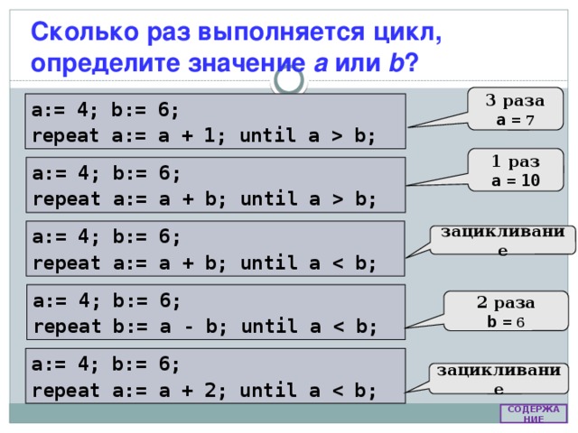 b; 1 раз a = 10 a:= 4; b:= 6; repeat a:= a + b; until a b; a:= 4; b:= 6; repeat a:= a + b; until a зацикливание a:= 4; b:= 6; repeat b:= a - b; until a 2 раза b = 6 a:= 4; b:= 6; repeat a:= a + 2; until a зацикливание СОДЕРЖАНИЕ " width="640"