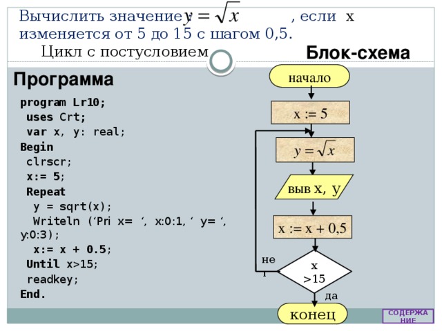 15; readkey; End. x := 5 выв x, y x := x + 0,5 нет x 15 да конец СОДЕРЖАНИЕ " width="640"