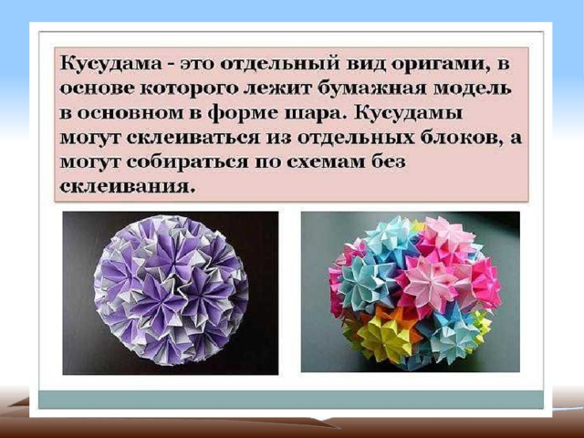 Кусудама - это отдельный вид оригами, в основе которого лежит бумажная модель в основном в форме шара. Кусудамы могут склеиваться из отдельных блоков, а могут собираться по схемам без склеивания.