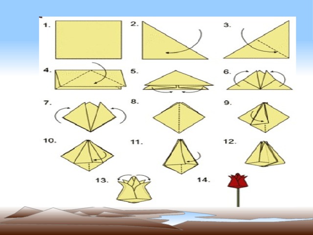 2.Обучать приемам скаладывания бумаги. научить складывать тюльпан.