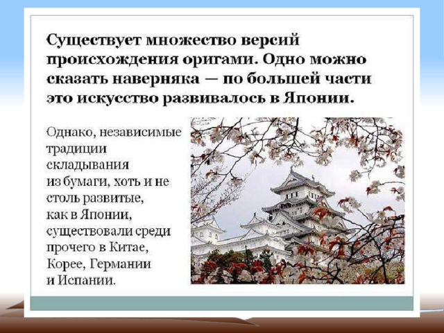 существует множество версий происхождения оригами. одно сказать наверняка - по большей части это искусство развивалось в Японии. Однако, независимые традиции складывания из бумаги, хоть и не столь развитые, как в Японии, существовали среди прочего в Китае, Корее, Германии и Испании. Оригами - это самобытное японское искусство создания модели различных предметов, животных птиц цветов путем сгибания листа бумаги.