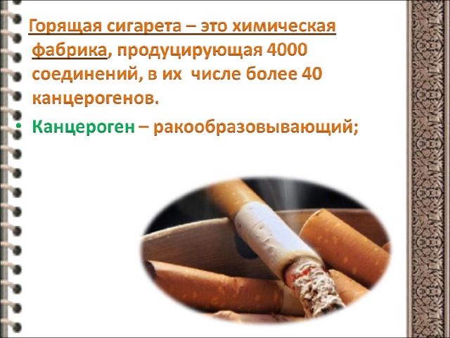 Горящая сигарета – это химическая фабрика, продуцирующая 4000 соединений, в их числе более 40 канцерогенов.