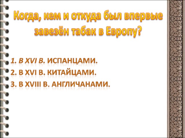 В Европу табак был завезён в 1496 году испанским монахом Романом Панно