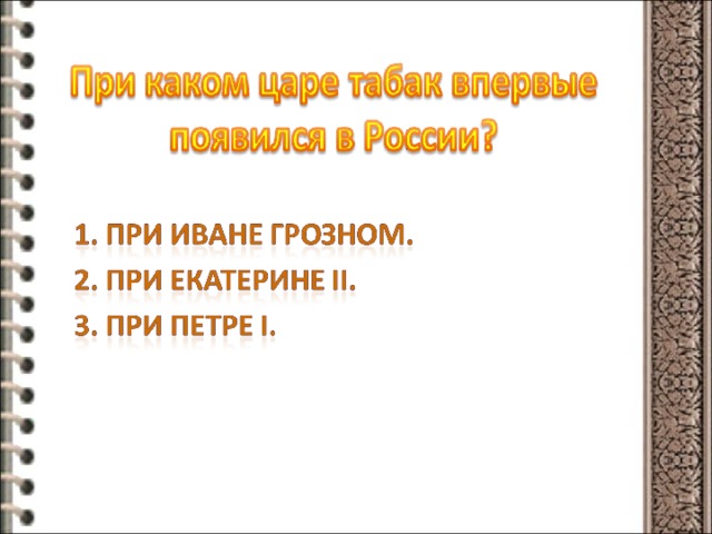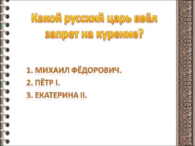 В России царь Михаил Фёдорович издал свод законов, в которых говорилось, что курильщиков табака следует наказывать шестьюдесятью палочными ударами по подошвам ног. А торговцам табака «пороть ноздри», резать носы и ссылать в дальние города.