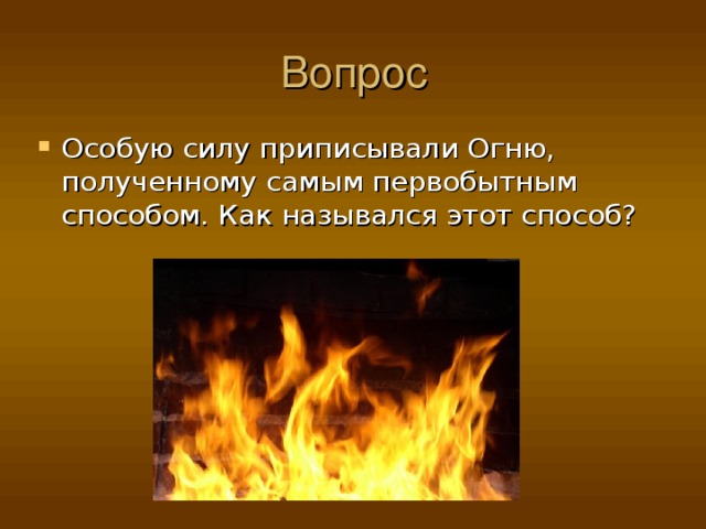 Особую силу приписывали Огню, полученному самым первобытным способом. Как назывался этот способ?