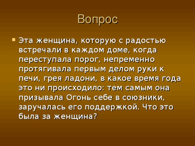 Эта женщина, которую с радостью встречали в каждом доме, когда переступала порог, непременно протягивала первым делом руки к печи, грея ладони, в какое время года это ни происходило: тем самым она призывала Огонь себе в союзники, заручалась его поддержкой. Что это была за женщина?