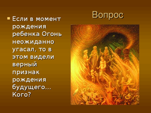 Если в момент рождения ребенка Огонь неожиданно угасал, то в этом видели верный признак рождения будущего… Кого?