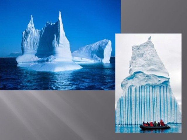 Густина льоду становить приблизно 0, 9 від густини води, тому дев’ять десятих усього об’єму айсберга перебуває у воді і лише одна десята об’єму височіє над поверхнею води. Саме тому айсберги дуже небезпечні для суден.