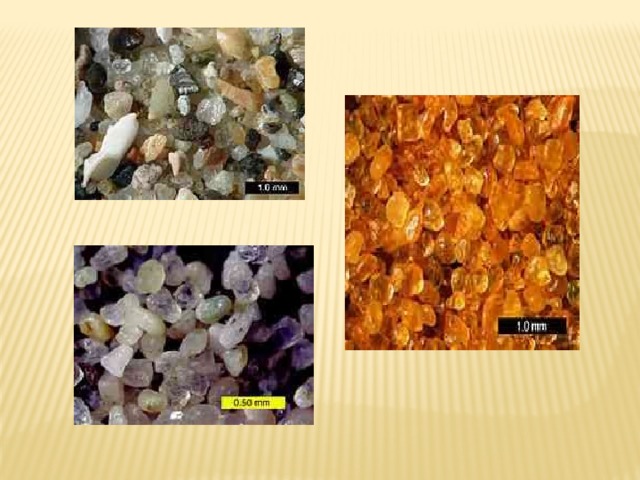 - Природные пески в зависимости от генезиса могут быть аллювиальными, делювиальными, морскими, озёрными, эоловыми. Пески, возникшие в результате деятельности водоёмов и водотоков, имеют более округлую, окатанную форму.