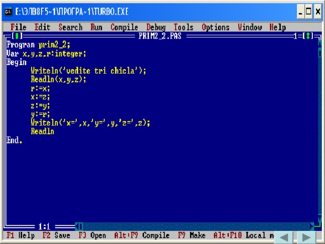Зарезервированные слова применяют для обозначения операторов (команд) и других элементов языка Паскаль. Их нельзя использовать в качестве имен и во всех программах они имеют одинаковый смысл. Зарезервированными словами в нашем примере являются слова: PROGRAM ( программа), VAR ( переменные), BEGIN (начало), READ (читать), WRITELN (писать), END (конец).
