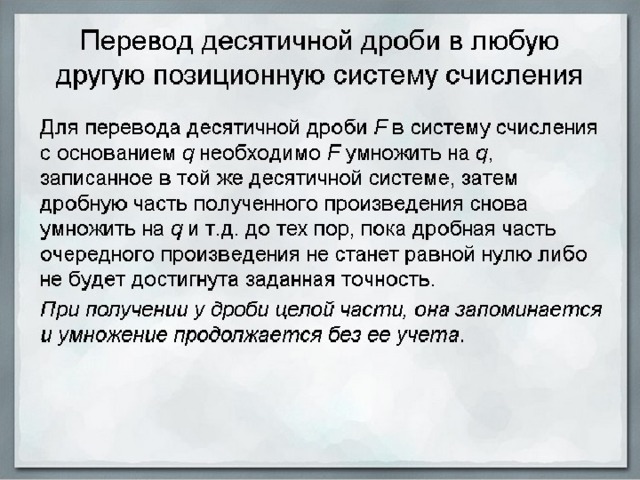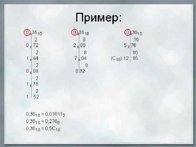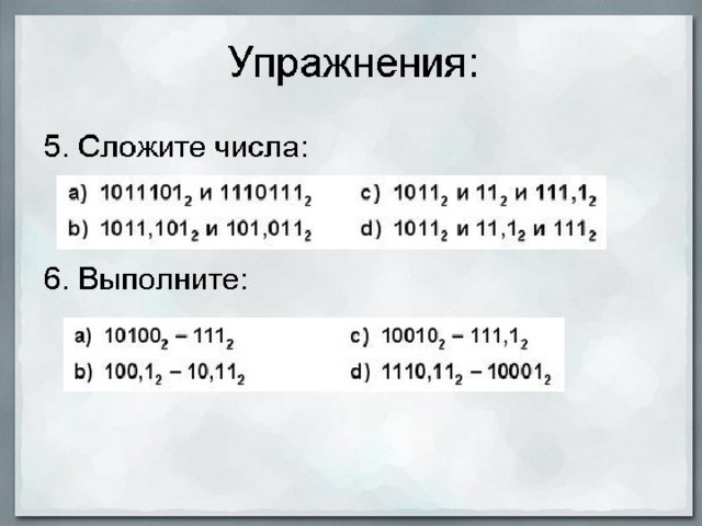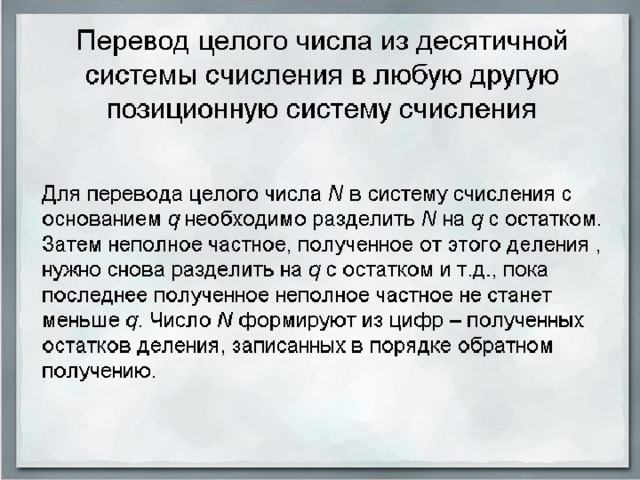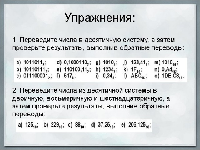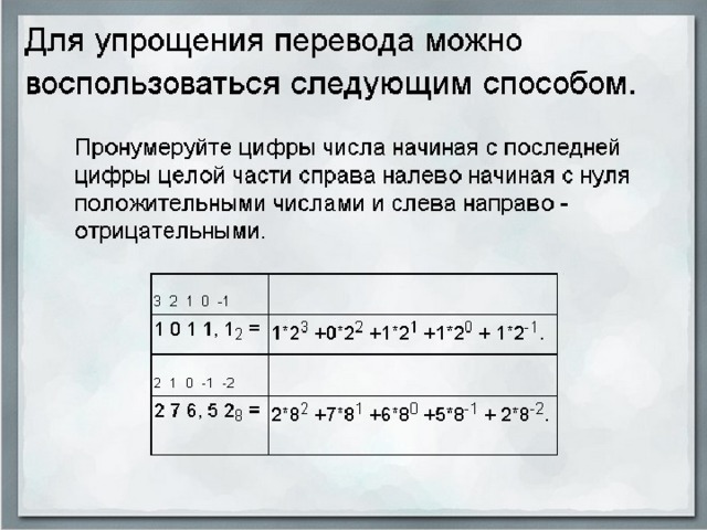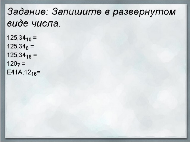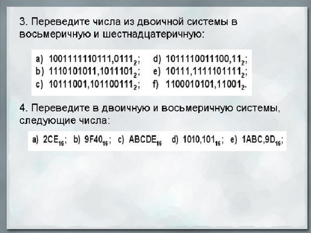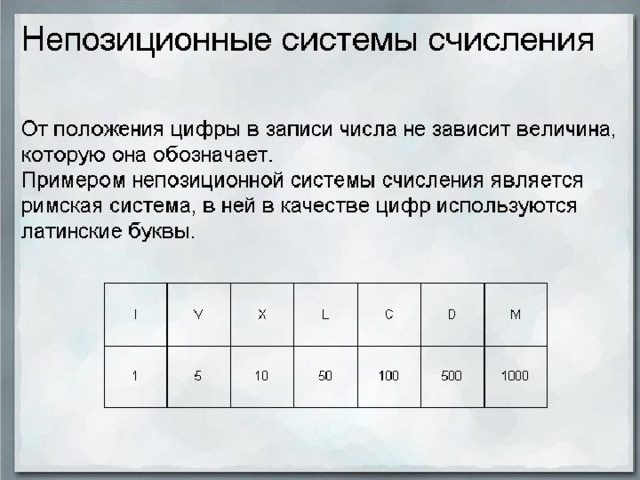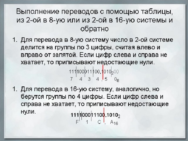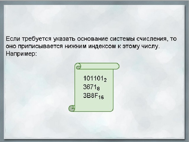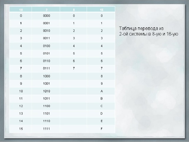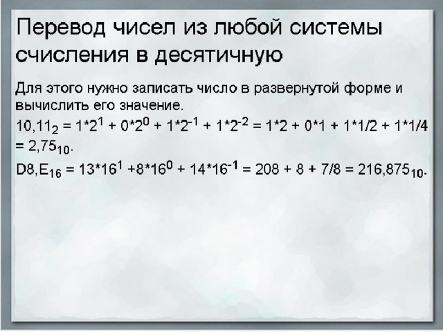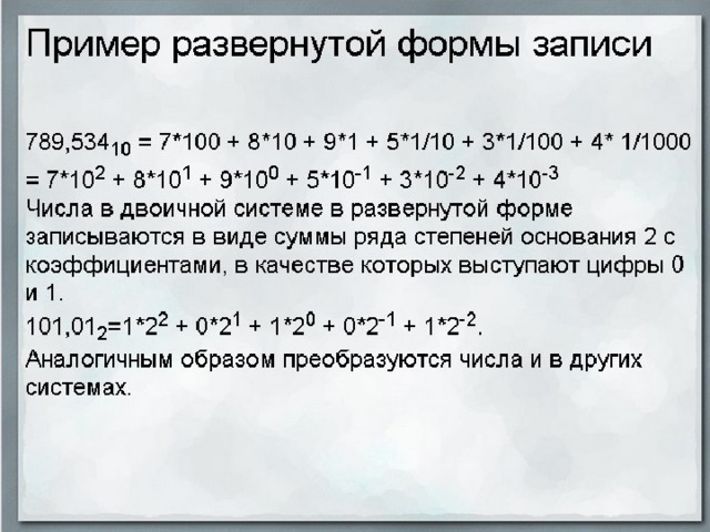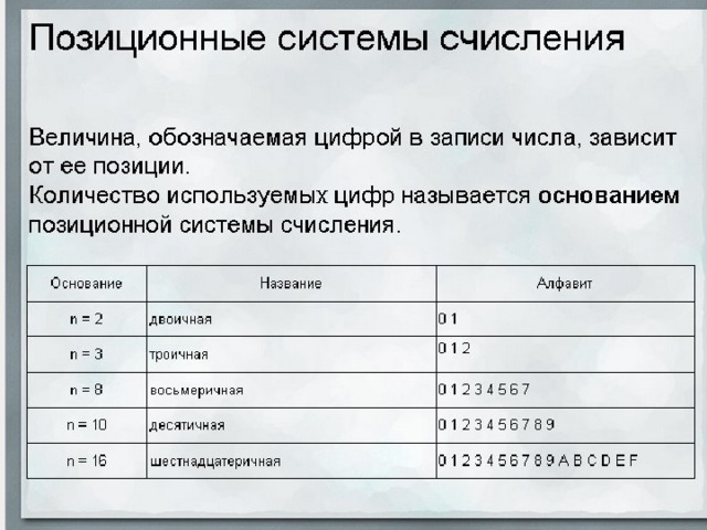 В презентации рассматриваются основные понятия темы: приводится развернутая форма записи числа, правила переводов чисел из одной системы счисления в другую, так же разбираются примеры, приведена таблица перевода между 2-ой, 8-ой и 16-ой системами счисления, рассмотрены арифметические операции (сложения, вычитание, умножение) в 2-ой системе счисления.