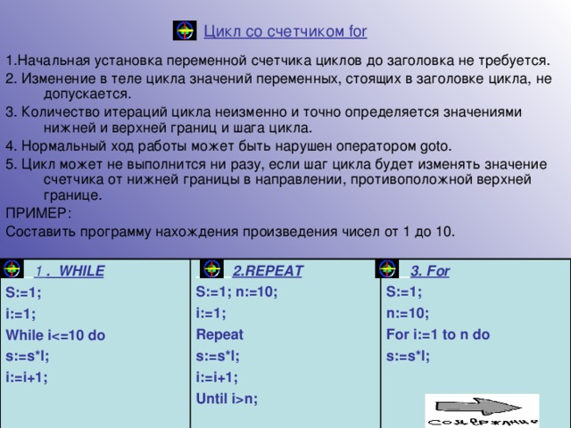 3. Количество итераций цикла неизменно и точно определяется значениями нижней и верхней границ и шага цикла.