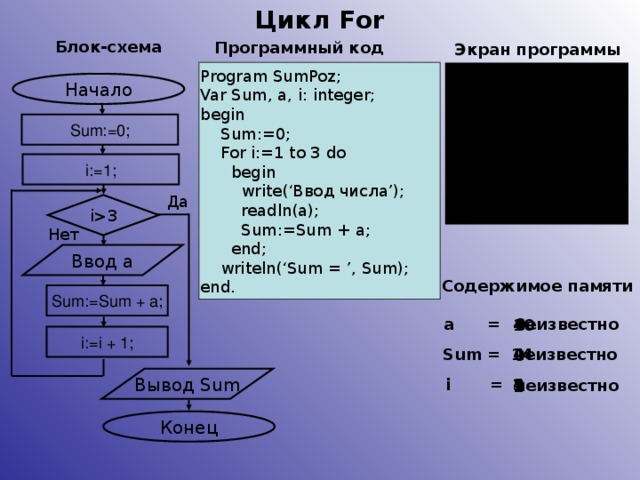 3 Нет Ввод а Содержимое памяти Sum:=Sum + a; a = 0 неизвестно 4 10 i:=i + 1; 14 Sum = неизвестно 4 0 Вывод Sum i = 3 4 неизвестно 2 1 Конец " width="640"