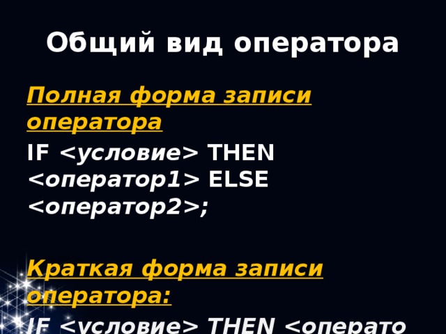 THEN оператор1 ELSE оператор2; Краткая форма записи оператора: IF THEN оператор; " width="640"