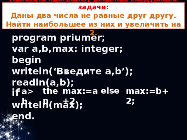Н аписать программу решения следующей задачи: Даны два числа не равные друг другу. Найти наибольшее из них и увеличить на 2.