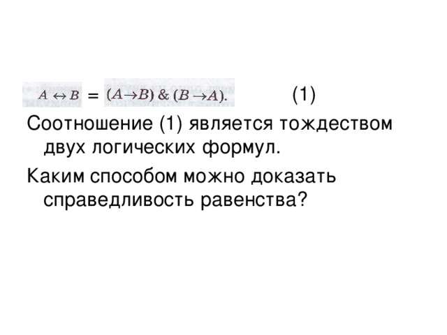 Рассмотрим пример равносильных высказываний слайд №3 и докажем, что данные формулы являются тождественными.