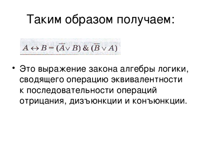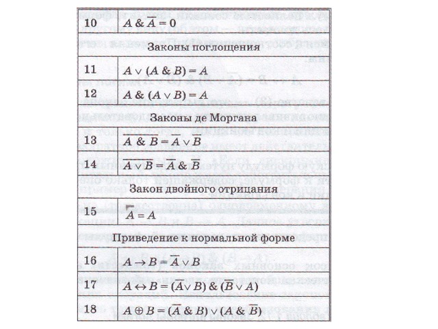 Далее доказываем, что любую логическую формулу путем тождественных преобразований можно привести к формуле, содержащей только операции отрицания, дизъюнкции и конъюнкции. Такой способ представления логической формулы называется нормальной формой.
