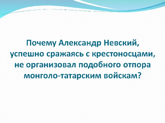 - Противоположную политику Александр вел по отношению к монголо-татарам. Это была политика мира и сотрудничества, целью которой было предотвращение нового нашествия на Русь.