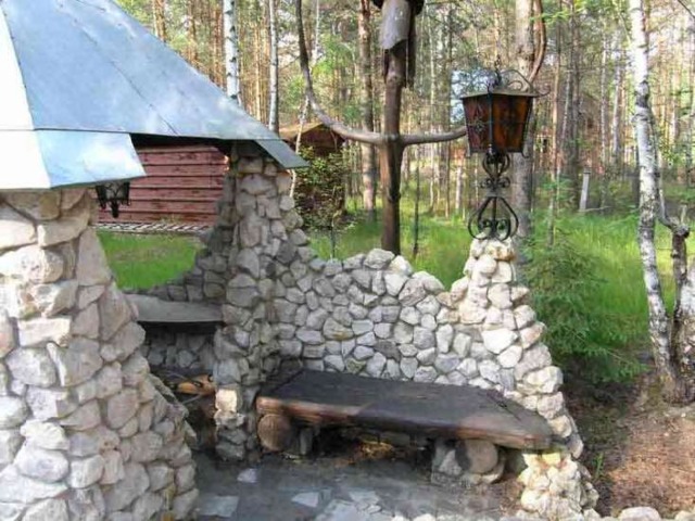 Баба Яга – не единственный местный житель. Чудеса здесь на каждом шагу. Куда ни посмотришь. Над летним душем загорается просто волшебный свет (грамотно подобранные витражи), на воротах огромный кованый паук свил паутину, в которую попались мухи, а около летней кухни вертел в форме необыкновенной рыбы…