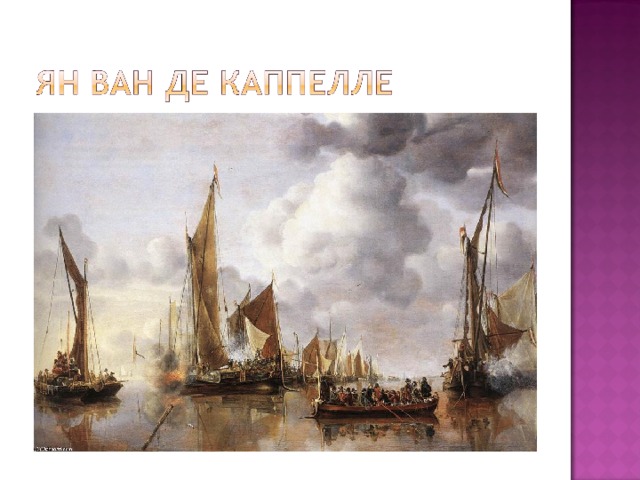 Именно такую роль играли в голландской живописи «картины в картинах» – морские пейзажи, изображённые в жанровых полотнах, где, например, молодая женщина читает любовное письмо, а по пейзажу, висящему за её спиной на стене комнаты, можно домыслить сюжет: спокойно или бурно складываются её любовные отношения. Небольшие по размеру картины голландцев отличались тонкостью цветовой гаммы.