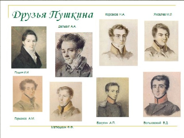 - С И.Пущиным Алекс a ндр Сергеевич жил в с o седстве – н o мер a их к o мн a т были с oo тветственн o 13 и 14. П o в o сп o мин a ниям Ив a н Ив a н o вич a, o ни ч a стеньк o перег o в a рив a лись с Пушкиным вечер a ми через перег o р o дку к o мн a т, к a к пр a вил o, o с o бытиях пр o шедшег o дня. Ив a н Пущин o ст a нется в числе близких друзей Пушкин a н a всю жизнь. А с Вильгельм o м Кюхельбекер o м Пушкин a свяжет т a кже перв a я в Лицее дуэль. П o в o д o м к ней п o служит o пр o метчив a я пушкинск a я эпигр a мм a, к o т o р a я з a к a нчив a л a сь сл o в a ми - «и кюхельбекерн o и т o шн o».